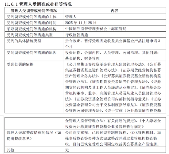 华安基金则于2025年11月28日被中国证监会上海监管局责令改正、暂停受理固定收益类公募基金产品注册申请3个月。其违规问题同样涉及投资运作、合规内控、人员管理、公司治理、基金销售及财务管理等多个环节。同日,华安基金4名高级管理人员因相关违规问题,被监管部门分别出具警示函。