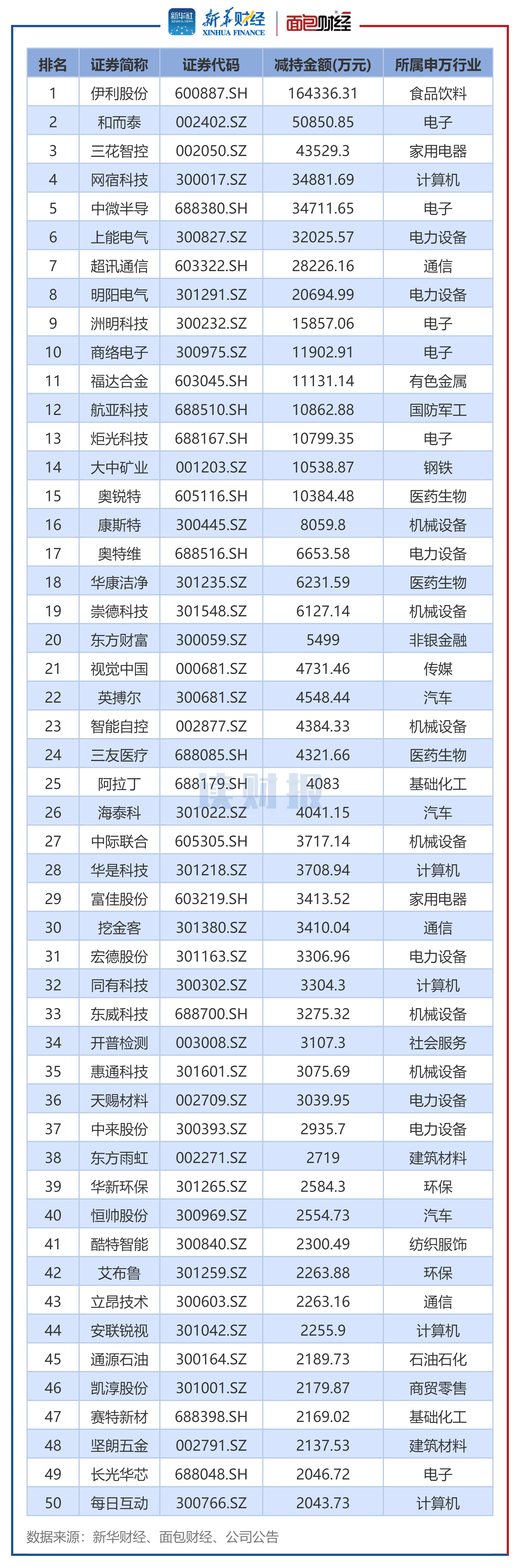 具体来看,3月减持金额最多的个股为伊利股份。该公司董事兼高级管理人员潘刚通过二级市场买卖的方式合计减持6199.03万股,减持金额约16.43亿元。