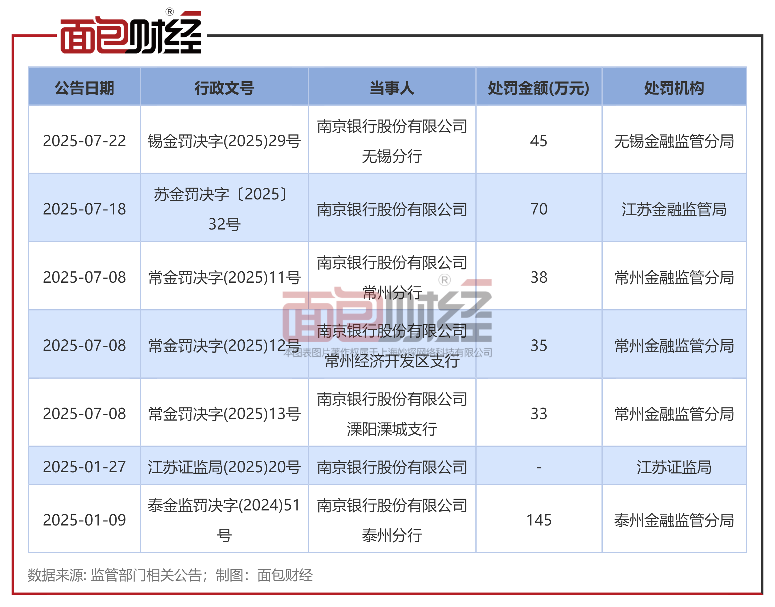 2025年7月18日,南京银行股份有限公司因监管统计指标计量不准确,被江苏金融监管局罚款70万元。