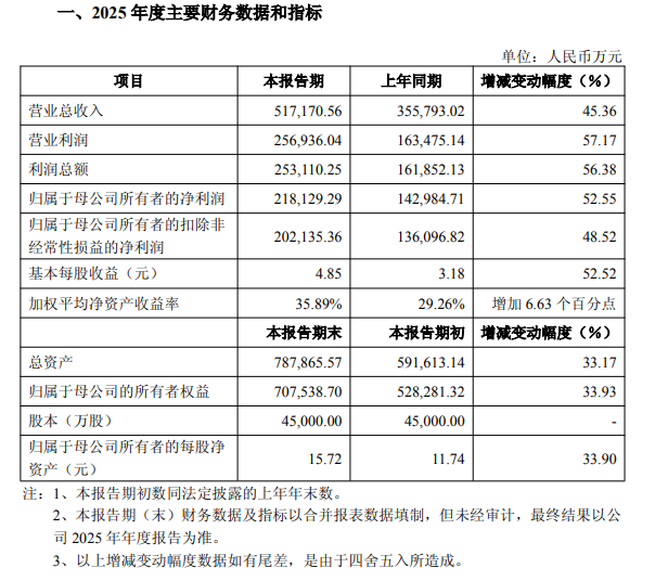 回顾2025年全年,公司实现营业总收入约51.72亿元,同比增长45.36%;实现归母净利润约21.81亿元,同比增长52.55%。