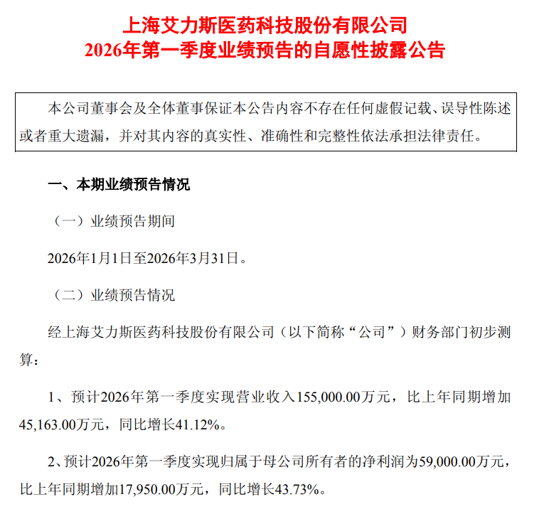 数据显示,艾力斯预计2026年第一季度实现营收15.5亿元,同比增长41.12%;预计实现归母净利润5.9亿元,同比增长43.73%。