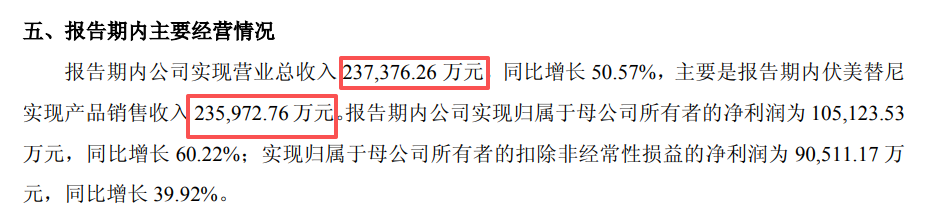 公司自主研发的 I 类新药甲磺酸伏美替尼片,用于表皮生长因子受体(EGFR)突变阳性非小细胞肺癌(NSCLC)患者的治疗。2025年上半年,伏美替尼实现产品销售收入约23.6亿元,占公司营收的比例超过99%。
