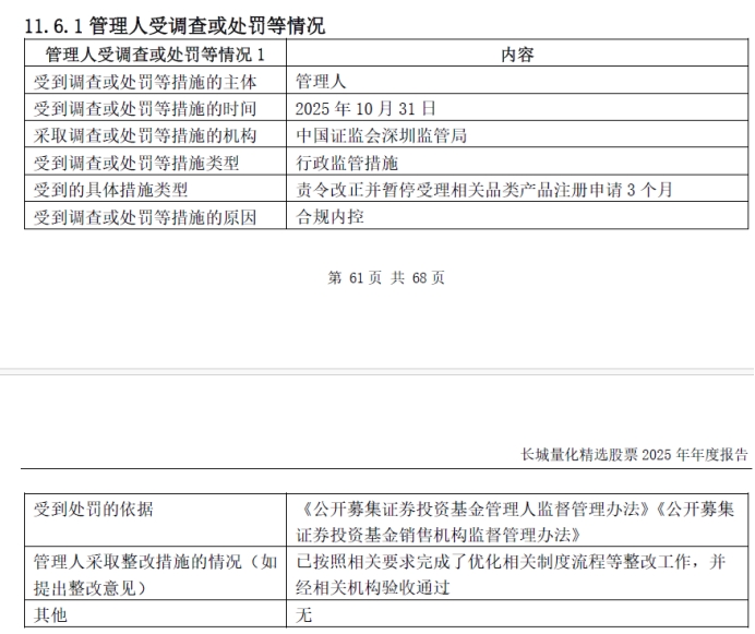 值得关注的是,根据基金年报披露,因合规内控问题,长城基金于2025年10月收到中国证监会深圳监管局责令改正并暂停受理相关品类产品注册申请3个月的行政监管措施。公司2名高管同步被出具警示函。