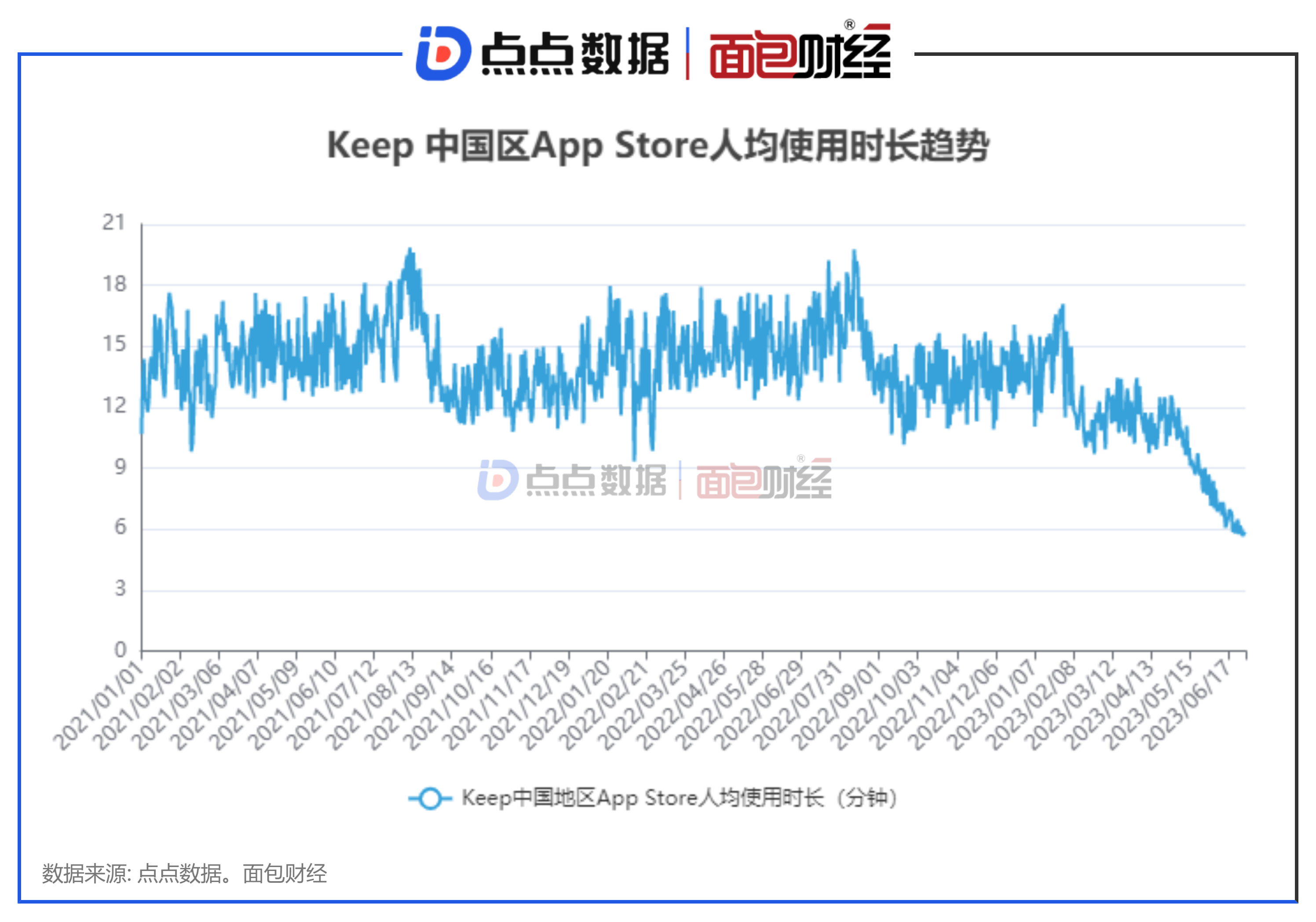 根据全球移动应用、游戏数据监测服务商点点数据的监测显示,2023年上半年,keep在中国内地App Store平台的累计下载量超960万次,平均日活约为221.56万人,两项指标较去年同期均下降近30%。