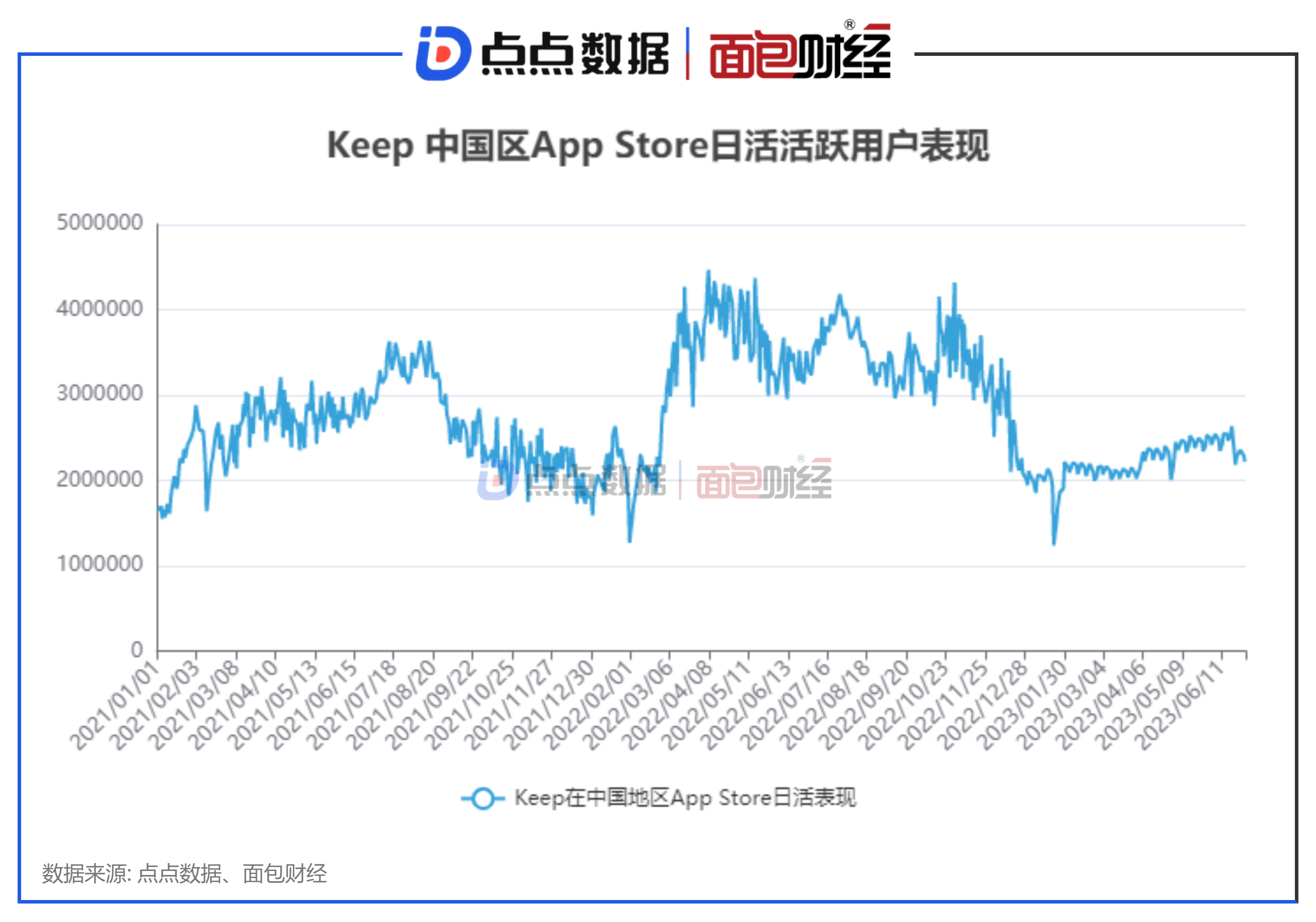 根据点点数据,Keep 2023年上半年在中国内地 App Store平台的平均日活约为221.56万人,维持在较高水平。但与去年同期相比下降约29%。
