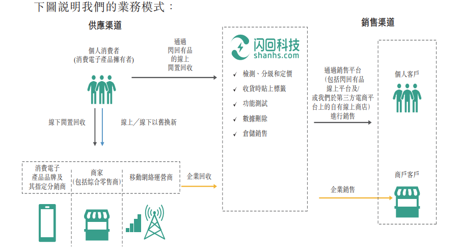 闪回科技有两个核心企业品牌:闪回收和闪回有品。闪回收是公司开展线下回收业务,通过上游资源合作伙伴从个人消费者回收二手消费电子产品的主要品牌。闪回有品是公司在自有线上平台及/或于公司在第三方电子商务平台上的自有网店向客户销售采购的二手消费电子产品的主要品牌。