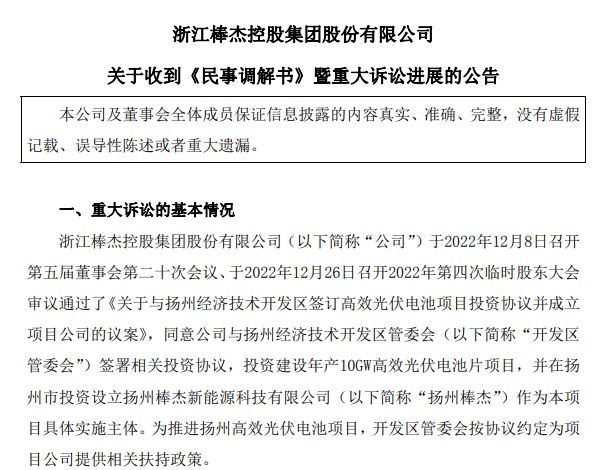 根据公告,棒杰股份因投资的光伏电池项目经营未达预期、子公司停产,与项目所在地扬州经济技术开发区管理委员会产生合同纠纷。近日,该诉讼案件已获得进展。公司收到扬州经开区法院送达的《民事调解书》,核心内容是各方协商一致确认:就2022年12月9日相关投资协议项下涉及的开发区管委会已经给付的1.4亿元到期补贴款债务,扬州棒杰确认1.4亿元到期补贴款并由开发区管委会按照破产程序依法申报债权进行破产分配,公司作为连带责任方,应于2026年9月30日前返还。