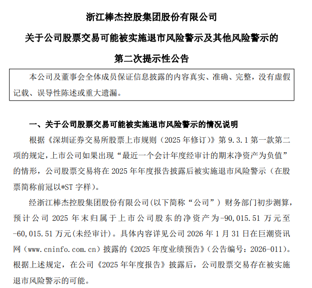 此外,棒杰股份还面临严重的财务困境。此前公告显示,经公司初步测算,预计2025年末归属于上市公司股东的净资产为负值,公司股票交易可能在2025年年度报告披露后被实施退市风险警示(*ST)。