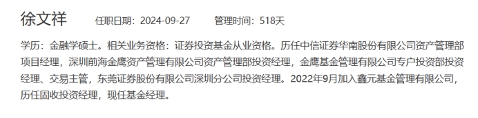 徐文祥自2022年9月起加入鑫元基金管理有限公司。其曾任中信证券华南股份有限公司资产管理部项目经理,深圳前海金鹰资产管理有限公司资产管理部投资经理,金鹰基金管理有限公司专户投资部投资经理、交易主管,东莞证券股份有限公司深圳分公司投资经理。