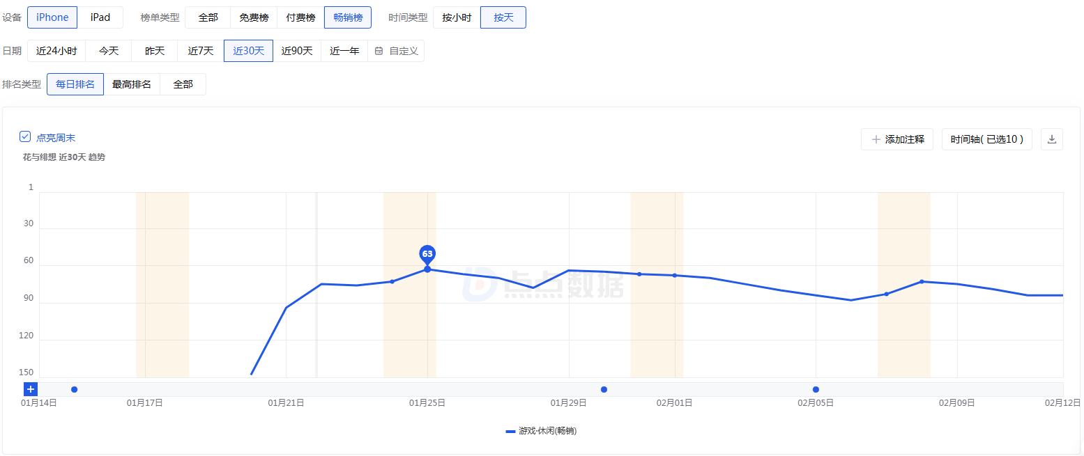 根据全球移动应用、游戏数据监测服务商点点数据的监测,《花与绯想》在中国内地iOS休闲游戏畅销榜最高排63名,近期排名保持相对稳定。