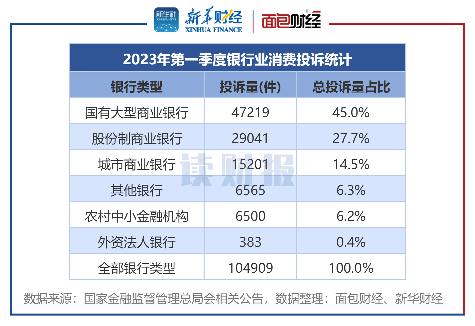 统计数据显示,2023年一季度国家金融监督管理总局处理银行业消费投诉104909件。按银行类型来看,各类银行的投诉增量与业务量和资产规模基本一致。
