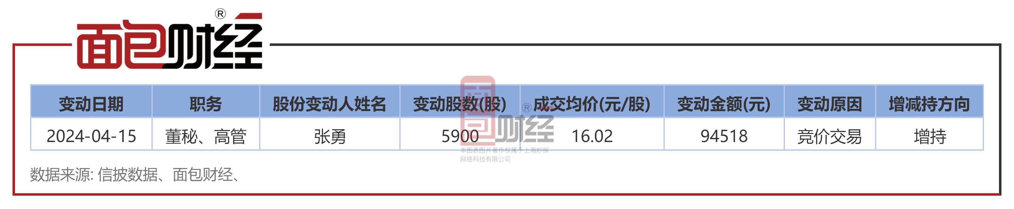 信披数据显示,2024年4月15日,英诺激光(301021.SZ)董秘、高管张勇通过竞价交易增持0.59万股 ,成交均价为16.02元/股 ,增持金额为9.45万元,变动后持股数为0.59万股。