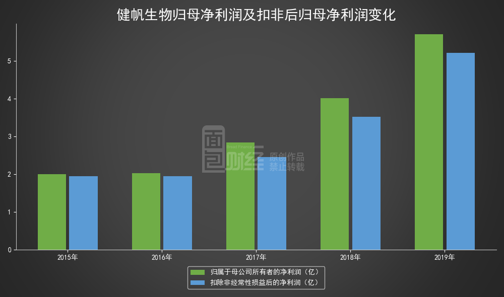 2019年,健帆生物营业总收入约14.32亿元;归母净利润约5.71亿元,同比增长42%。期内,公司非经常性损益约4883.48万元,扣非后归母净利润约5.22亿元。