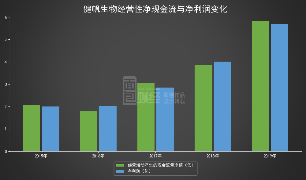 2019年,健帆生物经营性现金净流入约5.83亿元,同期净利润约5.69亿元,净利含金量(经营现金净流量/净利润)为1.03。