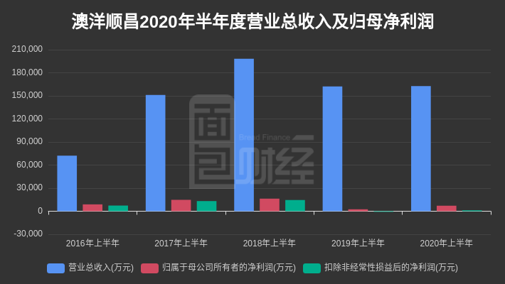 2018年上半年、2019年上半年和2020年上半年,澳洋顺昌营业总收入分别约19.83亿元、16.23亿元和16.26亿元,同比增速分别约31.23%、-18.13%和0.17%;归母净利润分别约1.64亿元、2530.41万元和7169.92万元,同比增速分别约10.42%、-84.56%和183.35%。