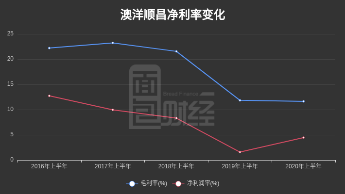 2020年上半年,澳洋顺昌净利率约4.45%,较上年同期有所同比提升;毛利率约11.64%,较上年同期有所下滑。2018年及2019年上半年,公司销售净利率分别约8.32%和1.58%;同期,毛利率分别约21.55%和11.84%。