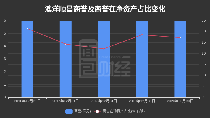 截至2020年06月30日,澳洋顺昌商誉约5.97亿元,与上年末持平,商誉在总资产中的占比约8.86%,在净资产中的占比约27.23%。